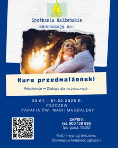 Aktualności Kurs przedmałżeński Mariusz Dudka 2026-01-09 2026-01-09 Kurs przedmałżeński – Rekolekcje w Dialogu dla narzeczonych 30.01 – 01.02.2026 r. – Pszczew, pw. Marii Magdaleny (bez noclegów) zgłoszenia pod numerem: 500 158 995 (po godz. 16.00)